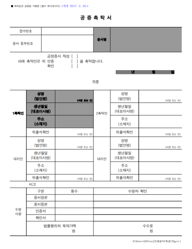 공증촉탁서 양식은 PDF 파일로 되어 있어서 프린트 후 직접 적으셔야 합니다.
