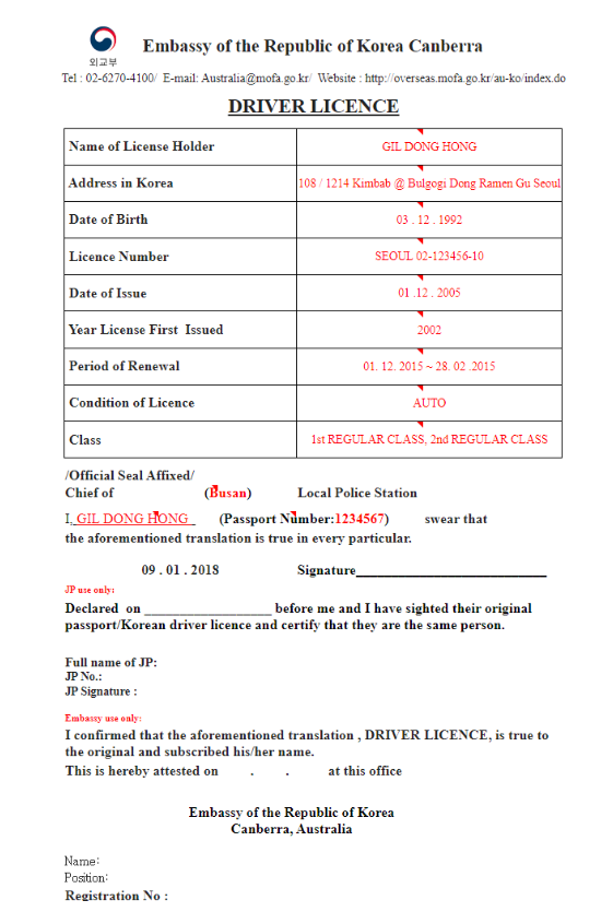 한국 운전면허증 번역문 공증 상세보기|공증주호주 대한민국 대사관 (mofa.go.kr)