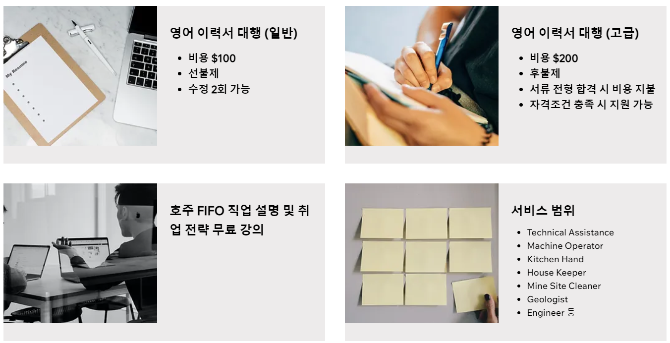 호주 FIFO(Fly In Fly Out) 취업을 원하시는 분들을 위해 이력서 및 면접 컨설팅 관련된 서비스를 제공하고 있습니다.